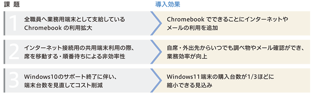 また、2025年10月にWindows10のサポート終了を迎え、本来であれば数百台の端末を入れ替える必要がありました。しかし「SecureBrowserを導入したおかげで、今まで各課に2,3台設置してきたインターネット接続用Windows端末は、外部メディア接続用に1台もあれば十分になりました」と綱島氏。職員各自のChromebook からインターネットへ接続できるようになったため、必要となるWindows11端末の台数は、従来の1/3ほどになる見込みです。必要台数が減少したことで、購入コストを抑えられるという大きなメリットが生まれました。